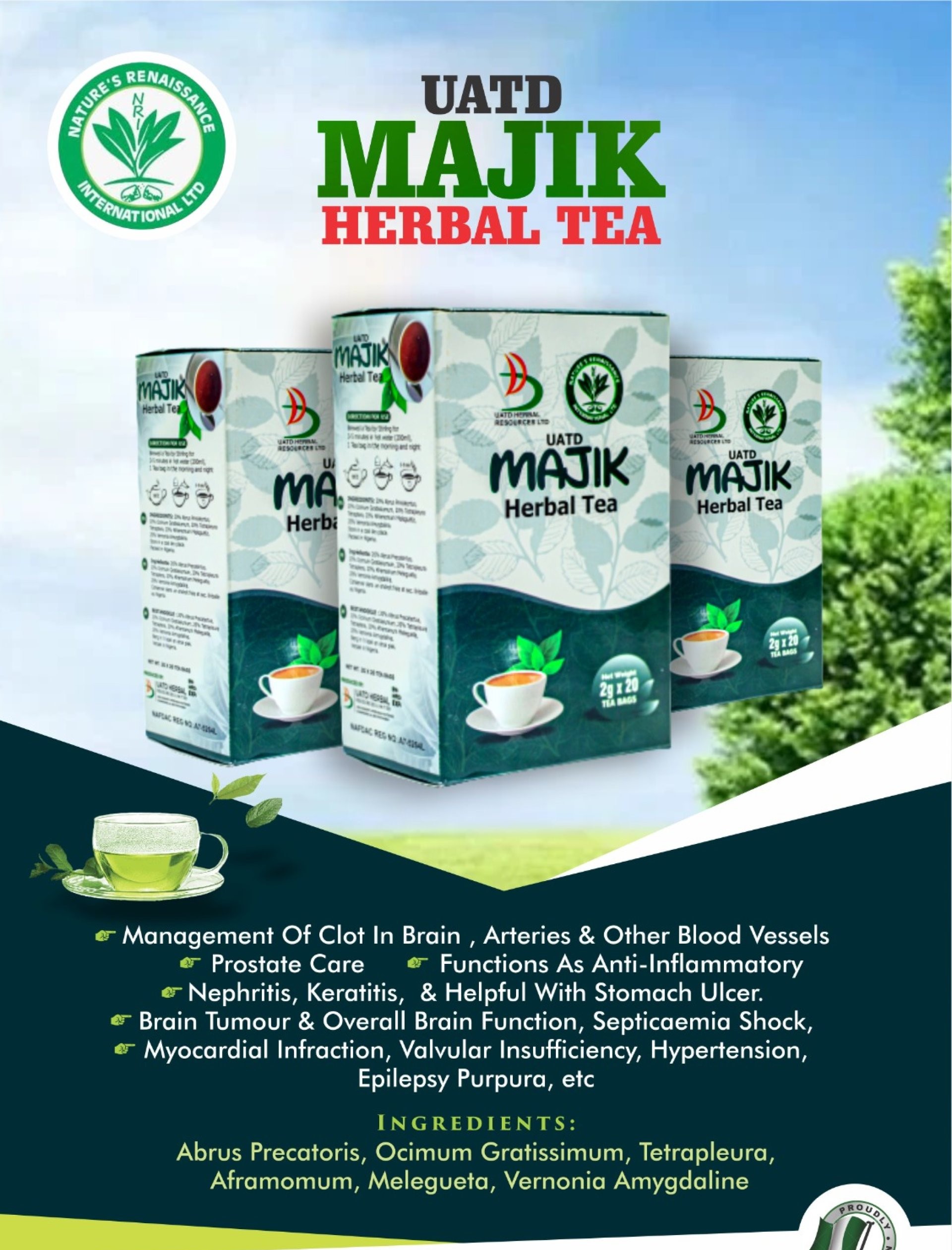 Majik Tea by NRI supports brain function, heart health, and inflammation relief. Helps manage blood clots, hypertension, epilepsy, prostate, and kidney problems naturally.